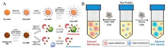 (A) Schematic representation of modification processes of dye-SiNPs and the selective detection for only MUC1(+) and HER2(+) breast cancer cells by Dual-SiNPs []. Copyright 2015 Elsevier B.V. (B) Schematic representation of cell detection/identification using Sgc8c-R6GDAR and TD05-R101DARNPs based on “turn-on” retro-self-quenched fluorescence []. Copyright 2015 American Chemical Society.