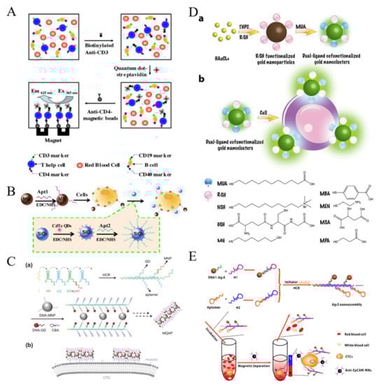 (A) Illustration of detecting the specific T-help cells using combination of two biomarkers with quantum dots as fluorescence probe and magnetic beads for immuno-separation []. Copyright 2011 Elsevier B.V. (B) Illustration of isolation and detection of MCF-7 cells by employing MUC1 aptamer-functionalized MBs and AS1411 modified QDs loaded on the surface of SiNPs []. Copyright 2013 Elsevier B.V. (C) Schematic illustration of MQAPs for magnetic isolation of CTCs. (a) Construction of MQAPs in two steps: (i) hybridization chain reaction mediated formation of the polymeric DNA template and (ii) co-assembly of DNA-QDs, DNA-MNPs, and DNA aptamers with the DNA template. (b) Multivalent binding between MQAPs and cell surface receptors for CTC isolation and detection []. Copyright 2018 WILEY-VCH. (D) Schematic illustration of the synthesis of the dual-ligand co-functionalized AuNCs and preparation of sensor array for cell identification based on the dual-ligand co-functionalized AuNCs. (a) Schematic illustration of the synthesis of the dual-ligand cofunctionalized gold nanoclusters. (b) Preparation of sensor array for cell identification based on dual-ligand cofunctionalized gold nanoclusters []. Copyright 2017 Elsevier B.V. (E) Schematic illustration of the procedure of isolation and detection of CTCs through the combination of Ag2S nanoassembly and anti-EpCAM-MNs []. Copyright 2018 American Chemical Society.