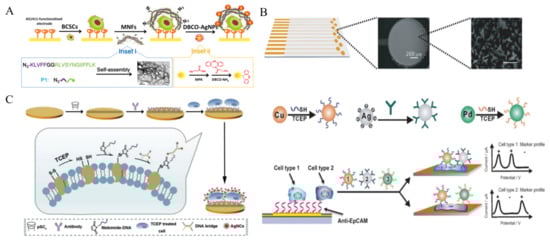 Carbon nanotubes (CNTs) have attracted considerable attention in the development of electrochemical biosensors because of their high electrical conductivity and excellent absorption ability []. For example, β-cyclodextrin-modified MWCNTs were used to identify cancer cells by modification with a tetrathiafulvalene derivative []. The negatively charged SWNTs induced the assembly of positively charged ferrocene-functionalized poly(ethylene imine) on the surface of electrode via the layer-by-layer technique, which allowed for the detection of FR-mediated HeLa cells []. Xu et al. developed a cytosensor with 3D-MWCNTs array based on vicinal-dithiol-containing proteins (VDPs) []. As shown in Figure 8A, MWCNTs were immobilized on the indium tin oxide (ITO) electrode as the nanostructured surface. 2-p-Aminophenyl-1,3,2-dithiarsenolane (VTA2) modified on the MWCNTs selectively reacted with vicinal dithiol in vicinal-dithiol-containing protein (VDP), which was over-expressed in cancer cells. Polydopamine (PDA) was used to encapsulate CNTs and immobilize FA for cell identification []. HA conjugated on the surface of positively charged poly(diallyldimethylammonium chloride)-modified CNTs by the electrostatic interaction could specifically recognize CD44 by ligand-protein interaction [].