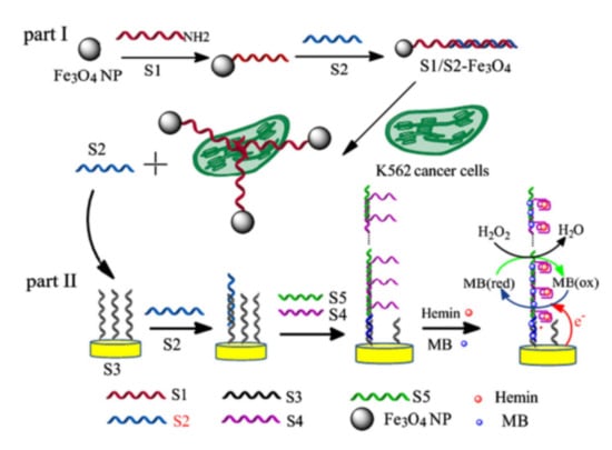 - Sun, D.P.; Lu, J.; Zhong, Y.W.; Yu, Y.Y.; Wang, Y.; Zhang, B.B.; Chen, Z.G. Sensitive electrochemical aptamer cytosensor for highly specific detection of cancer cells based on the hybrid nanoelectrocatalysts and enzyme for signal amplification. Biosens. Bioelectron. 2016, 75, 301–307. [Google Scholar] [CrossRef]
