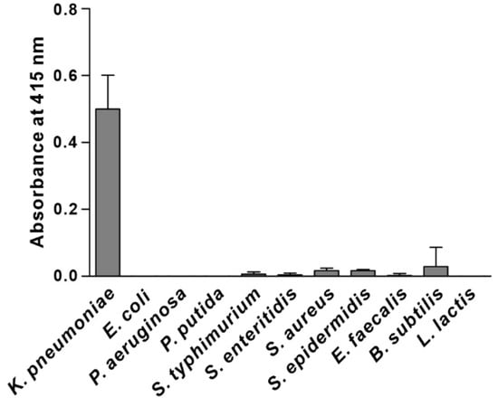 To analyze the specificity of the peptide identified by phage display, the peptide was subjected to ELISA against different bacteria as described in Section 2.4. The bacterial cells were resuspended in PBS and incubated in ELISA plates overnight at 4 °C to achieve coating. Subsequently, ELISA was performed using the biotinylated KP peptide (10 μM) as the recognition element. The bound peptide was detected using the streptavidin-HRP conjugate (1:2000 in blocking buffer, Thermo Fisher Scientific).