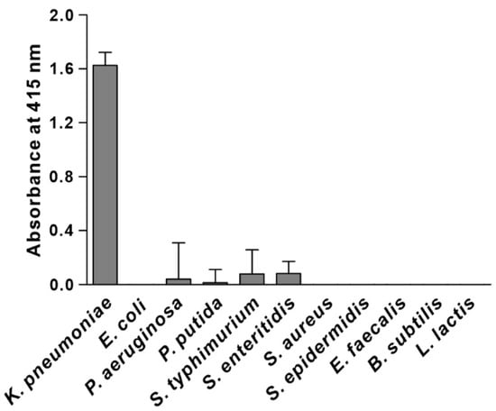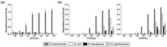 Ten-fold serial dilutions of log-phase bacterial cultures were added to wells of a microtiter plate and incubated overnight at 4 °C. Biotinylated KP peptide (10 μM) and two commercially available biotinylated anti-Klebsiella spp. polyclonal antibodies (1:5000, GTX36396 (Genetex, Irvine, CA, USA), ab69468 (Abcam, Cambridge, UK)) were added to the plate. After incubation and washing, the streptavidin-HRP conjugate was added to the plate for detection. The other steps were performed as described above (see detailed protocol in Section 2.4).