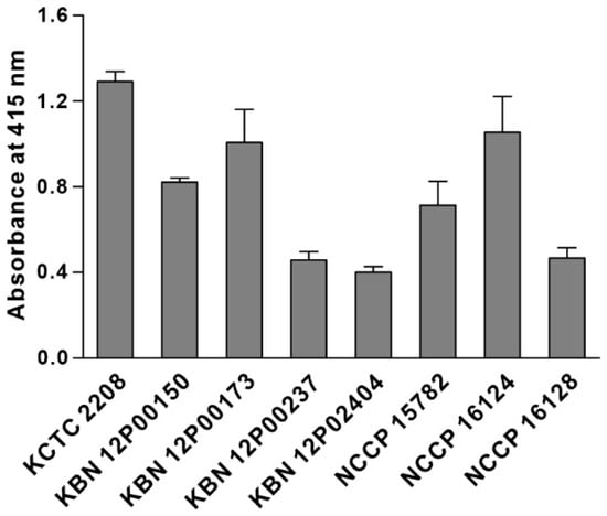Capacity of KP peptide to detect clinical K. pneumoniae isolates. Microtiter plates were coated with K. pneumoniae KCTC 2208 and seven clinical isolates and incubated with the biotinylated KP peptide. The bound peptide was detected by HRP-conjugated streptavidin and the substrate ABTS. The data are presented as the mean ± SD of three independent experiments performed in triplicate.