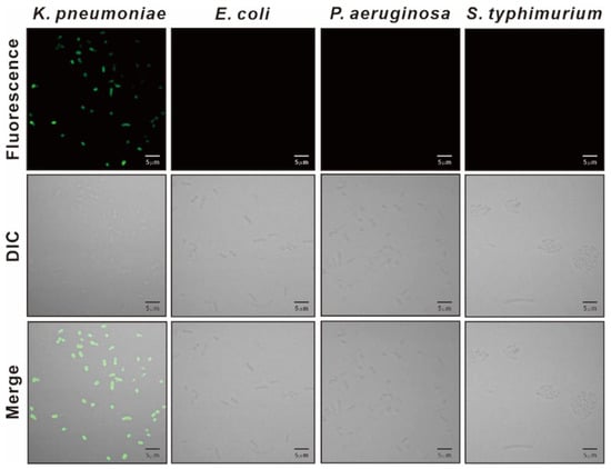 We synthesized the KP peptide with a C-terminal Lys as a biotin tag and investigated the ability of this peptide to interact preferentially with K. pneumoniae relative to a panel of selected Gram-negative bacteria and Gram-positive bacteria. As illustrated in Figure 2, KP peptide showed significant binding to K. pneumoniae and little or no binding to the other bacterial strains as observed with the phage-binding ELISA. We then assessed the binding capacity of KP peptide against seven clinically isolated K. pneumoniae strains, including antibiotic-resistant strains (Figure 3). ELISA assay confirmed that KP peptide is a specific and selective recognition element for different K. pneumoniae strains, including the antibiotic-resistant strains. As the KP peptide showed specific binding to K. pneumoniae in ELISA, we further investigated its ability to bind to the target bacterium using confocal laser scanning microscopy. Figure 4 demonstrates that the peptide was explicitly bound to the outer surface of K. pneumoniae, supporting the ELISA results.