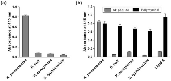 Validation of binding activity of KP peptide to LPS. The binding of KP peptide to LPS from K. pneumoniae and their cross binding to LPS from the other Gram-negative bacteria were determined by peptide-binding ELISA. Extracted LPS (a), commercially available LPS, and lipid A (b) were coated onto microtiter plates. Peptides (biotinylated KP peptide and polymyxin B) bound to the coated LPS were detected by HRP-conjugated streptavidin and the substrate ABTS. The data are presented as the mean ± SD of three independent experiments performed in triplicate.