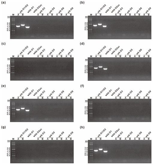 Genotyping of O antigen in a panel of clinical K. pneumoniae isolates by PCR. Agarose gel images showing the PCR amplification of the primers using the genomic DNA of K. pneumoniae as the template were presented. The primer pair name was indicated on top of each lane. The band sizes of the DNA ladder are shown on the left. (a) K. pneumoniae KCTC 2208, (b) K. pneumoniae KBN 12P00150, (c) K. pneumoniae KBN 12P00173, (d) K. pneumoniae KBN 12P00237, (e) K. pneumoniae KBN 12P02404, (f) K. pneumoniae NCCP 15782 (g) K. pneumoniae NCCP 16124, (h) K. pneumoniae NCCP 16128.