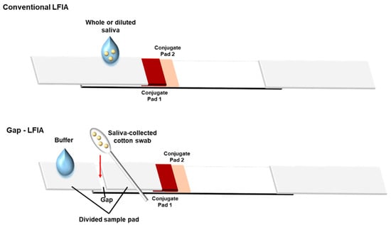 In this study, we developed the gap-LFIA, a modified cotinine LFIA sensor, to directly use for the whole saliva collected via a cotton swab. The detection of cotinine with the gap-LFIA is a competitive assay between salivary cotinine and cotinine-BSA immobilized on a detection membrane. To improve the cotinine detection sensitivity of the gap-LFIA strips, the concentrations of the anti-cotinine antibody and secondary antibody-AuNP conjugates dried on each conjugate pad were optimized. The conjugates required fewer primary antibodies and improved LFIA sensitivity.
