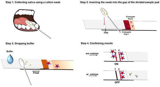 For immediately on-site and portable cotinine detection, colorimetric lateral flow immunoassay (LFIA) is used with gold conjugates. Because the cotinine has an insufficient size for a common sandwich immunoassay, competitive substance and antibodies were immobilized on paper strips to detect small molecules by competitive immunoassay []. When cotinine is present in the sample, fewer antibodies bind to the immobilized competitive substance in the test line. As a sample for detecting cotinine, most studies use urine or saliva, which are non-invasive and more accessible than other biological liquids. Although saliva is more advantageous for testing than urine, which is limited in time and space for field diagnosis, most commercially available cotinine kits are urine-based, not saliva-based, because of the low sensitivity of kits using saliva with high viscosity and impurities [,,]. The composition of saliva differs from person to person, and it depends on food intake, hydration status, smoking, and saliva collection method. Moreover, viscosity of mucin from saliva could affect downstream analysis []. Therefore, highly sensitive studies require oral hygiene procedures to avoid the contamination of samples by food. The pretreatments make it difficult to set up proper rapid saliva testing conditions applicable in on-site detection. Therefore, in the cases of commercial on-site saliva-based detection kits, they require filtering or dilution after collection of saliva by spitting or chewing sponge for using whole saliva, in order to overcome the background effect (Table 2). Moreover, they require more volume of saliva and time to collect a sufficient amount of sample for testing. In this study, a simpler and more accurate saliva-based detection method for cotinine that can harness the convenience of saliva is developed, using a cotton swab. Moreover, since a relatively identical amount of sample is applied using the swab, the individual differences between users can be reduced compared to conventional cotinine kits.