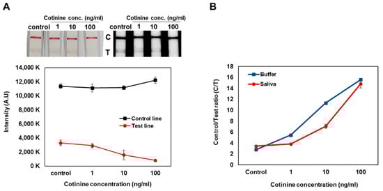 Cotinine concentration test spiked in saliva by the gap-LFIA with 25 ng/mL anti-cotinine antibody on conjugate pads. (A) Comparison for intensities of control line and test line. (B) Conversion to Control to Test ratio. All data shown are presented as the mean ± SD (n = 3).