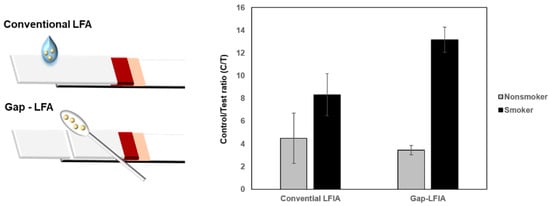 The C/T values of the saliva samples from smokers and non-smokers showed distinct differences in the LFIA test. When the whole saliva was used without dilution, deviations in C/T values were higher compared with those of gap-LFIA. Automatically diluted saliva reduced background hindrance and provided appropriate conditions for cotinine detection (Figure 4). The results indicate that gap-LFIA is more accurate for immunoassay than conventional LFIA and is more suitable for saliva-based detection. In addition, unlike the existing method of directly applying whole saliva, the saliva is slowly drawn out by the buffer, so there is little chance that the flow will be blocked due to the components in the saliva in the paper-based strip. In the general LFIA, the average C/T value for non-smokers was 4.5 (±2.2) and 8.3 (±1.8) for smokers. In the general LFIA, the average C/T value for non-smokers was 4.5 (±2.2) and 8.3 (±1.8) for smokers. In contrast, it was 3.4 (±0.4) for non-smokers in gap-LFIA and 13.2 (±1.1) for smokers. When the same samples were applied to the gap-LFIA, it was confirmed that the difference between smokers and non-smokers was larger, and the deviation between groups decreased compared to the conventional LFIA. Most cotinine diagnostics have a cutoff of 10–100 ng/mL, which is usually in a wide range for detection but not as highly sensitive. The reason is that salivary cotinine is as high as a few ng/mL in non-smokers and 20 ng/mL or more in steady smokers. In this study, the C/T ratio was calculated and analyzed by testing up to the lowest cutoff of 10 ng/mL and lower concentrations. The C/T ratio of 10 ng/mL cotinine in saliva was about 7.1 (Figure 3B). The distinction between smokers and nonsmokers is ambiguous in C/T 7.1 due to the high standard deviation in conventional LFIA, but it can be seen that they are clearly distinguished in the gap-LFIA (Figure 4). Visually, at a cotinine concentration of 10 ng/mL, the signal of the test line was significantly weakened, showing a difference from the control line.