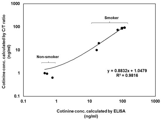 Correlation of cotinine concentrations calculated by ELISA and the gap-LFIA C/T ratios in salivary samples.