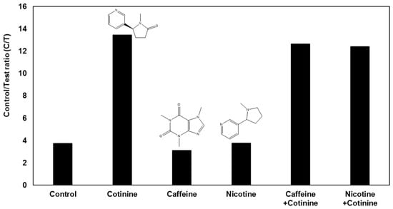 The gap-LFIA sensor has selectivity for other compounds contained in saliva; hence, the compound does not affect the signal of the cotinine sensor. A selectivity test with a 100-fold concentration of caffeine and nicotine compared to that of cotinine, which have alkaloid structures in saliva, was performed (Figure 6). Regardless of the presence of caffeine or nicotine, the sensor produced the same result for cotinine and confirmed no interference.