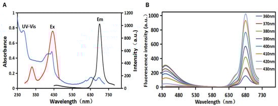 As shown in Figure 1A, the UV–VIS absorption peak of the synthesized CDs absorption spectrum at 270 nm could be attributed to the π–π* transition of the conjugated aromatic sp2 bonds [,]. The absorption spectrum of CDs also displayed several characteristic absorbing peaks at 395 nm, 420 nm, 640 nm, and 680 nm, which could be attributed to the n–π* and π–π* transitions of the aromatic π system containing the C=O, C=N, and C=S bonds, respectively []. These heteratomic groups could form polycyclic aromatic hydrocarbon or oxygen-containing structures on the surface of CDs. Additionally, the CDs had an excitation peak at 420 nm and an emission peak at 680 nm. The fluorescence excitation band of CDs overlapped with its main UV–VIS absorption band, indicating that the emission was closely related to these absorption bands caused by related structures []. The maximum absorption wavelength of CDs was used as the fluorescence excitation wavelength to obtain the fluorescence emission spectrum of CDs. Figure 1B shows the emission spectrum of the dual-emission fluorescence CDs. The quantum yield of R-CDs was calculated to be 13.64%. Under single-wavelength excitation, there were two maximum emission peaks in the blue (λEm = 442 nm) and red (λEm = 680 nm) regions. When the excitation wavelength increases from 360 nm to 430 nm, the two fluorescence emission peaks do not shift. It was indicated that the synthesized CDs showed excitation wavelength-independent fluorescent emission. This characteristic may be related to the surface state or the uniform particle size of CDs, which can avoid the interference of autoluminescence in application. As λEx increases from 360 nm to 430 nm, the fluorescence intensity at λEm 442 nm and 680 nm increases and then decreases. When λEx = 380 nm, the fluorescence intensity at λEm = 442 nm is the strongest. When λEx = 420 nm, the fluorescence intensity at λEm = 680 nm is the strongest. Under short-wavelength light excitation, CDs have two characteristic fluorescence emission peaks in the blue and red regions of the spectrum. These dual-fluorescence bands observed may be attributed to core- and surface-state emission []. Being capable of excitation at different wavelengths makes the CDs attractive for a variety of applications. In this case, red fluorescence (λEm = 680 nm) was selected in biological studies to reduce the interference caused by biomolecules’ self-fluorescence, resulting in minimal light damage and deeper tissue penetration []. Therefore, the red carbon dots (R-CDs) prepared in this work were used as fluorescent probes for metal element detection.