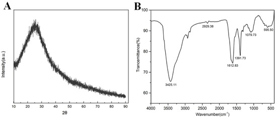 R-CDs were characterized by XRD. As shown in Figure 3A, R-CDs had a wide diffraction peak at 2θ = 26° corresponding to plane 002 of the sp2 hybrid ink carbon, which was consistent with the TEM results []. The FT-IR spectrum of R-CDs is shown in Figure 3B. A wide FT-IR absorption band appeared at 3000~3500 cm−1, which was caused by the stretching vibration of the O-H bond and the N-H bond []. Two characteristic absorption peaks appeared at 1079 cm−1 and 1391 cm−1, which were caused by the stretching vibration of the C-O bond and the C-N bond. The peak at 1612 cm−1 was caused by the C=O stretching vibration []. The results show that there were abundant functional groups on the surface of R-CDs, such as amino, hydroxyl, and carboxyl groups, demonstrating the good hydrophilicity of R-CDs.