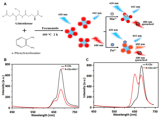 Schematic illustration of the preparation of R-CDs and the application in the detection of Mn2+ and Zn2+ (A). Fluorescence spectra of R-CDs (black curve) and R-CDs+Mn2+ (red curve) (B). Fluorescence spectra of R-CDs (black curve) and R-CDs+Zn2+ (red curve) (C).