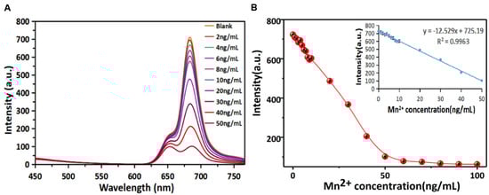 Fluorescence responses of the R-CDs upon the addition of different concentrations of Mn2+ (A) and the linear correlation of fluorescence intensity versus the concentrations of Mn2+ in the range from 0 ng/mL to 100 ng/mL (B).