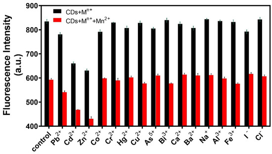 Specificity is also an important factor in the evaluation of the analytical performance of fluorescent probes. Sixteen interference ions were selected for specificity experiments. A certain amount of R-CDs solution was mixed with 20 μL of interfering ions (20 ng/mL), and the changes in fluorescence intensities were recorded under the same conditions. As shown in Figure 6, when R-CDs were mixed with other interfering ions, the fluorescence intensity of the (R-CDs + Mn+) did not change significantly compared with the fluorescence intensity of R-CDs. However, when Mn2+ was added to the (R-CDs + Mn+) mixture, the fluorescence intensity decreased significantly, which was consistent with the change in fluorescence intensity of (R-CDs + Mn2+). The results show that the fluorescent probe had good selectivity for Mn2+. Among all kinds of interference ions, Cd2+ and Zn2+ showed different degrees of interference. In the real macroalgae sample, the content of Mn2+ and Zn2+ is much higher than that of Cd2+ [,], and the interference caused by Cd2+ can be ignored.