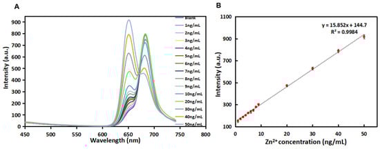 Fluorescence responses in the λEm = 650 nm of the R-CDs upon the addition of different concentrations of Zn2+ (A) and linear correlation of fluorescence intensity versus the concentrations of Zn2+ in the range from 1 ng/mL to 50 ng/mL (B).