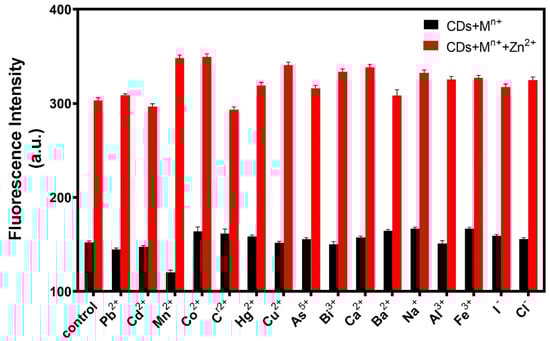 To evaluate the specificity of the fluorescent probe, sixteen interference ions were selected. A certain amount of R-CDs solution was mixed with 20 μL of interfering ions (20 ng/mL), and the changes in fluorescence intensities were recorded under the same conditions. As shown in Figure 8, when R-CDs were mixed with other interfering ions, the fluorescence intensity of the (R-CDs + Mn+) did not change significantly compared with the fluorescence intensity of R-CDs. However, when Zn2+ was added to the (R-CDs + Mn+) mixture, the fluorescence intensity increased significantly, which was consistent with the change of fluorescence intensity of (R-CDs + Zn2+). The results show that the fluorescent probe had good selectivity for Zn2+.