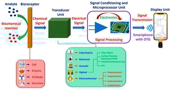 Biosensors can come in various sizes, shapes, and electrode materials, and can detect and evaluate viruses, pathogens, and diseases. They take the form of a small probe or an electronic device to generate an indicator that can be used to quantify further processing; the electronic device is responsible for communicating, recording, and detecting the changes in the physiological parameters of the biological or chemical components in the environment. The device includes (i) an analyte, (ii) biological material, (iii) a transducer, (iv) an electronic module, and (v) a display unit (see Figure 2). When the tested material is introduced into an electrolytic solution, its constituents are recognized (alcohol, glucose, lactose, and ammonia). Biorecognition creates a signal creation during the interaction between the analyte and the biological components, while the transducer transforms a biorecognition signal into a quantifiable electrical form, which indicates the presence of a biological or chemical objective. The analyte–bioreceptor interactions are proportional to the electrical or optical signals produced by the transducers, which can be connected to the cloud server to access and store the data; the output data can take the form of graphical, numerical or tabular analyses [].