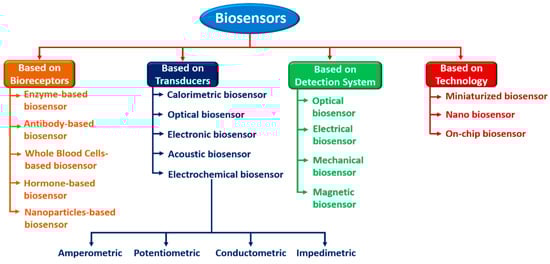 Sensors can be divided into several categories based on their components or analytes to be detected. Active sensors must be powered from a separate source such as a thermistor, microphone, or strain gauge, which are also called parametric sensors. Passive sensors produce signals but do not need any external power source to operate; photodiode, piezoelectric, thermocouple, and thermistor sensors are some examples. Contact-based sensors such as temperature sensors and mechanical sensors necessitate physical contact with stimuli, whereas contactless sensors such as magnetic and optical sensors do not need any physical contact. Absolute sensors respond to stimuli on a vast scale, such as strain gauges and thermistors. The environmental stress determines the pressure, while the relative sensors detect the catalyst in relation to a fixed or changing reference, such as a thermocouple measuring the heat difference. An analog sensor is a device that converts the continuously changing physical parameter into an analog signal. Analog sensors include temperature, humidity, and pressure, to name a few. In a digital sensor, the output is in Boolean format. Depending on the type of signal detection, these sensors are classified as (i) chemical, (ii) thermal, (iii) physical, and (iv) biological. These have been widely employed in biomedical fields, as well as in the MEMS domain []. Figure 3 shows the classification of various types of biosensors depending on the diverse use of bioreceptors and transducers.