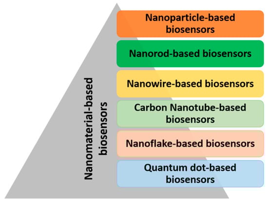 Due to advances in nanotechnology, biosensor research has become more diverse []. Exploring nanomaterials based on metals and metal oxide-based nanoparticles, nanorods, nanowires, nanoflakes, nanocones, nanospherical, carbon nanotubes, quantum dots, and nanocomposites opens up the possibility to boost biosensor performance, thereby raising detection power by controlling size and shape [,]. Different kinds of nano-biosensors are shown in Figure 4; these work on the same principles as their macro-and micro-counterparts, but signal and data translation are performed at the nanoscale. Nano-biosensors are used for (a) physical and chemical events that are being monitored in challenging circumstances, (b) medical diagnostics and the detection of biochemicals in cellular organelles, (c) detecting nanoparticles in industrial and environmental applications, and (d) the detection of the potentially dangerous contaminants at ultra-low concentrations.