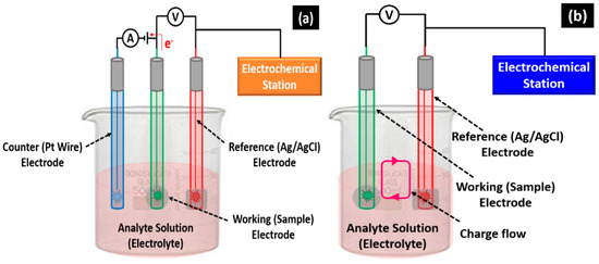 Biosensors have been fully investigated and extensively used in biological and biochemical applications [] since these work on analyte- and transducer-based electrochemical characteristics and have good selectivity, sensitivity, and bioanalyte detection capability [,]. Electrochemical biosensors are classified based on their transduction mechanism: (i) potentiometric, (ii) amperometric, (iii) impedimetric, (iv) conductometric, and (v) voltammetric. Figure 5 shows a schematic representation of different types of electrochemical biosensors.