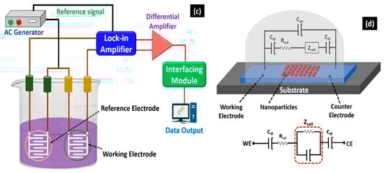 Schematic diagram of (a) amperometric/voltammetric, (b) potentiometric, and (c) conductometric biosensors, and (d) equivalent circuit of the impedimetric biosensor.
