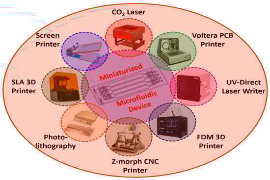 Schematic representation of various fabrication techniques used in the development of miniaturized microfluidic biosensors.