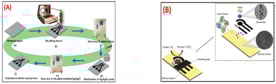 Yong et al. [] reported a simple and new idea for the droplet-based electrochemical sensing of several analytes associated with pharmaceutical, environmental, water, and food monitoring, making it very useful due to its cost-effectiveness and easy screen printable fabrication. The proposed biosensor has been employed in electrochemical applications in microfluidic environments (Figure 9A).