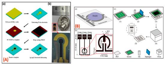 (A) (a) Schematic illustration of the fabrication of micro-patterned design with proposed heavy-metal-detection sensor with three electrodes and TRGO coating onto Au electrode; (b) photomicrograph of a miniaturized and completely integrated sensor []. (B) (a) Droplet-based electrochemical (EC) sensor design principle; (b) sensor component sizes and three-electrode arrangements; and (c) schematic illustration of the droplet-based sensor production technique using screen printing []. Reprinted from the above-mentioned references with permission of copyright from the respective journals.
