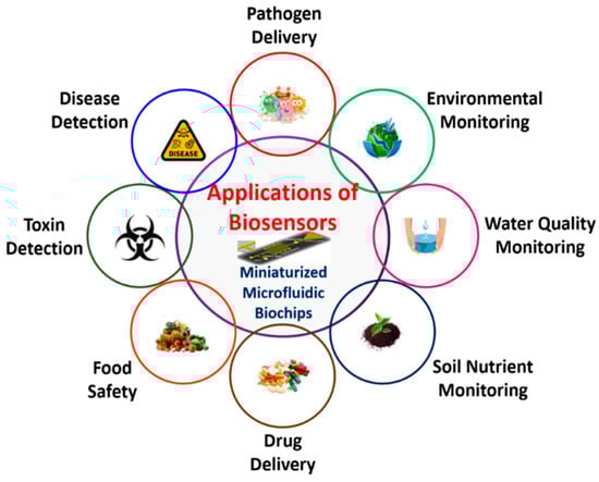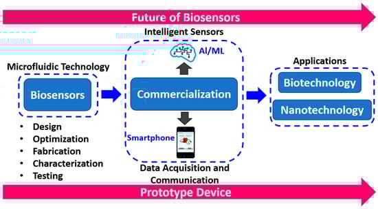 Biosensors are attractive devices used in academia, industries, and research laboratories [,,]; they have the exceptional ability to recognize a biological event on a transducing device using a signal proportional to the analyte concentration to quantify a biological or biochemical response. In physiological fluids such as blood, urine, saliva, tears, and sweat, biosensors monitor diseases, water contamination, and disease-causing bacteria, and also act as biomarkers []. Biosensors have opened up new horizons in recent years, emphasizing biological domains to benefit mankind, healthcare, food, and environmental monitoring []. They can also help in high-throughput screening, homeland security, food safety, agriculture, medicine, environment, and pharmacology []. Advances in microfluidics have facilitated the design and development of miniaturized devices to control, coordinate, and modify micro-volumes of fluid via microchannels ranging from 10 to 100 microns []. Microfluidics is an area of microscale laminar fluid flow for better heat and mass transport which has created important platforms in biomedical diagnostics [,]. Due to a large surface-to-volume ratio, microfluidic-based devices can operate the fluid management in microchannels by significantly lowering the reaction volume, thereby demonstrating the essential movement of thermal mass and temperature gradients more efficiently and effectively. Furthermore, low-castability is a key point in the design and fabrication of various biosensors.