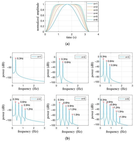 Figure 2a illustrates the respiratory waveform within one respiratory cycle described by Equation (12) as gradually changes from 1 to 6, with an amplitude set to 1 and a fundamental frequency () of 0.3 Hz. It is observed from Figure 2a that the value of determines the proportion of time occupied by the smooth transition period within one respiratory cycle, where a larger corresponds to a longer smooth transition period. Figure 2b presents the power spectrum of each respiratory waveform in Figure 2a, demonstrating that the number of harmonics is , consistent with theoretical analysis.