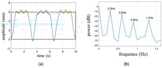 According to the calculation rules for the circumscribed rectangle area of the respiratory signal, the average of the vertical coordinates of the upper curve (indicated by the green portion in Figure 5a) yields the top coordinate of the rectangle () as 5.96 mm. The average of all the valley points (marked with green dots at the bottom of the waveform in Figure 5a) determines the bottom coordinate of the rectangle (), which is 0.03 mm. The circumscribed rectangle is represented by a red outline. The area of the rectangle can be calculated as , while the covered area by the cardiopulmonary waveform is calculated as . In the digital signal, the waveform is discrete, so the area is obtained by summation, where y represents the wave function of cardiopulmonary movement and Δt represents the discrete time interval. The ratio between the two areas is , and according to Table 2, this corresponds to , which matches the set value.