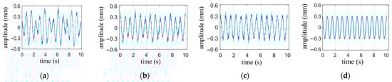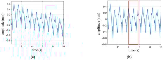 The waveform of the respiratory signal is generated based on Equation (9), with the following parameter settings: , , and . The heartbeat signal is simulated using a single-tone wave with the parameters amplitude , frequency and the initial phase is zero. Gaussian white noise with a signal-to-noise ratio of 40 dB is added to the signal. The duration of the waveform is set to 10 s. The simulated waveform is shown in Figure 4. Since the amplitude intensity of the respiratory signal is 20 times stronger than that of the heartbeat signal, the overall waveform in Figure 4 primarily represents the periodic characteristics of the respiratory signal, with the heartbeat waveform being clearly visible only in the smooth region of respiration. The cutoff frequency for the high-pass filter is set to 0.8 Hz.