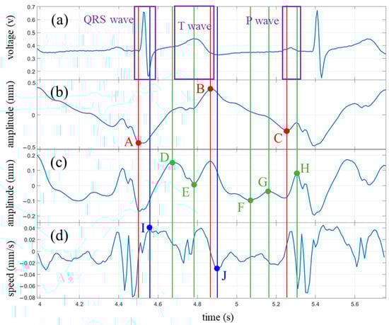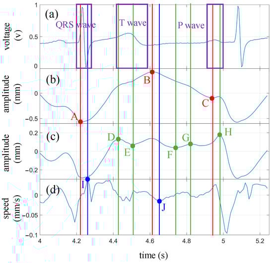 The characteristic points of a signal are generally the extreme points of the waveform, representing the state of the signal at which it is about to change. In [], cardiac activity was measured using a single-tone continuous wave radar, and the velocity waveform was obtained by differentiating the heartbeat waveform. A comparison was made between the velocity waveform and the ECG signal, noting that three extremal points in the velocity waveform corresponded to specific positions in the ECG waveform. The minimum velocity value (maximum in this paper) occurred within the QRS complex, while another velocity peak (minimum in this paper) corresponded to the end of the T wave. It was also observed that the first minimum preceding the minimum velocity always occurred at the beginning of the P wave. The experimental results in this paper reproduced the first two characteristic points, but the third one was an exception. The reason may be that differential calculation is very sensitive to small fluctuations. Noise and the degree of detail restoration of the waveform can lead to significant fluctuations in velocity waveforms, resulting in a lack of stability in the characteristic points of velocity waveforms.