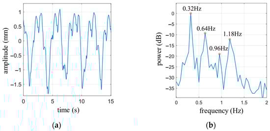 The subject sits quietly in a chair, with the radar positioned 0.4 m away from the chest. The experiment was conducted under the normal breathing state of the subject. The measurement duration was set to 15 s. Figure 11a shows the measured cardiopulmonary activity waveform, and Figure 11b is the power spectrum of (a).