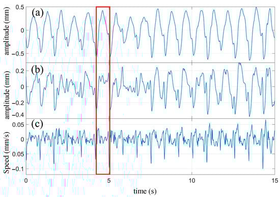Applying the frequency domain filtering method with a cutoff frequency of 0.8 Hz, the measured signal was high-pass filtered. Simultaneously, the precise elimination of respiratory harmonics within the passband was achieved, resulting in the extraction of the heartbeat signal. Subsequently, the obtained heartbeat signal was processed by first applying the frequency domain filtering method to remove the fundamental component of the heartbeat signal. Then, the signal was differentiated to obtain the velocity waveform. The processed waveform is shown in Figure 12.