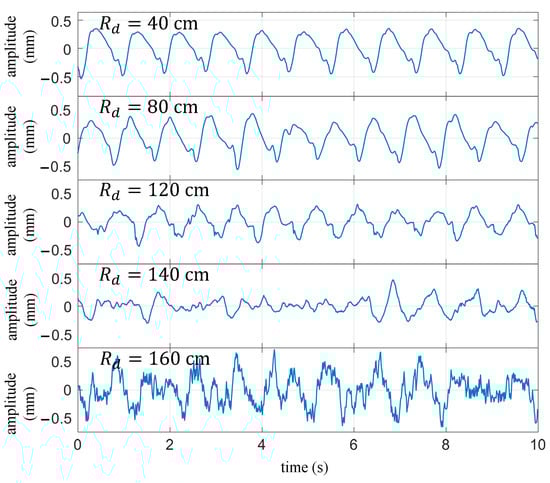 During practical measurements, the quality of the signal is influenced by various factors, such as the radar transmission power, the angle between the radar beam and the human body, and the distance between the radar and the chest. In real-world applications, is a variable quantity that can significantly impact the measurement results of the cardiopulmonary signal. Figure 14 illustrates the extracted heartbeat signals under normal breathing conditions with different values of . The measurement process adopted a single variable method to minimize the influence of other factors, keeping the external environment constant, maintaining the same posture for the subjects, and keeping the radar transmission power and the angle relative to the human body unchanged. It can be observed that as Rd increases, the heartbeat waveform gradually distorts. When is equal to 120 cm, the details of the signal waveform experience severe distortion but still exhibit periodicity of the heartbeat. However, when exceeds 140 cm, the waveform can no longer reflect the periodicity of the heartbeat.
