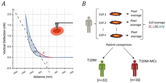 Unfortunately, a single FD cycle cannot be considered representative of the biomechanical behavior of a patient’s cells. Therefore, we measured 10 cells per patient, acquiring 8 × 8 pixel elasticity maps. Starting from these values, the mean of the diverse elastic parameters was computed across cells, and the value was assigned to each patient, as schematically represented in Figure 1B.