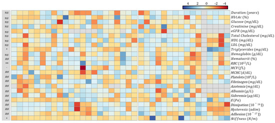 Heatmap of clinical (duration), biochemical (red blood cell indices, hematocrit, lipid, liver, glucose, and renal panel), and mechanical parameters. To enable a simultaneous visualization of all parameters, the measured values are normalized in terms of z-scores. The gray color indicates missing values, which can be considered random. Statistical significance is indicated as follows: * p < 0.05, ** p < 0.01, ∙ p < 0.1 and ns (not significant).