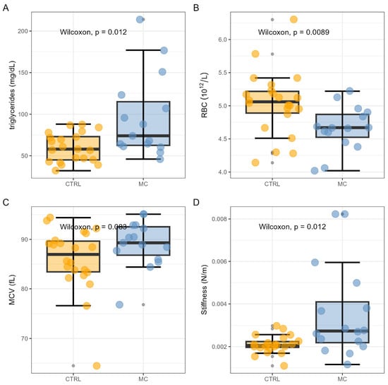 A box plot analysis of these variables is presented in Figure 3A–D. Specifically, an elevation in plasma triglyceride (TG) levels is observed in subjects with MCs compared to controls (Figure 3A, p = 0.012). A significant reduction in RBC count is also observed (Figure 3B, p = 0.0089), suggesting a potential alteration in erythropoiesis in pathological subjects. Increased MCV values, albeit not statistically significant (p = 0.083), are shown in Figure 3C. Particularly interesting for our purposes, a significant difference is noted in the values of the mean RBC stiffness, which is increased in subjects with complications (p = 0.012, Figure 3D).