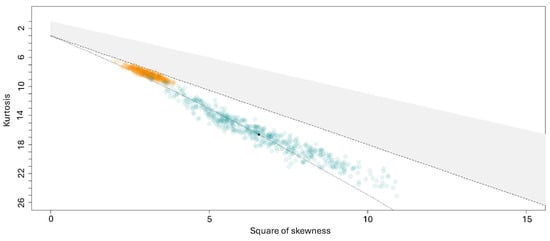 The shape of the distribution of selected parameters, specifically Young’s modulus E, was examined by generating a Cullen and Frey plot, a statistical chart where the experimental distribution kurtosis () is plotted against the experimental squared skewness (). This analysis was conducted using a slightly modified version of the “descdist” function within the R “fitdistr” package [,]. This function incorporates a nonparametric procedure, which calculates skewness and kurtosis values from a set of bootstrapped samples generated by resampling the original distribution with replacement.