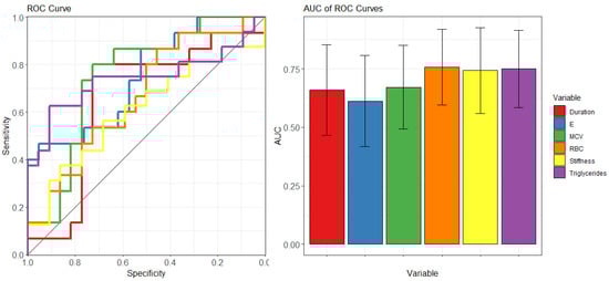 The analysis in Figure 5 identifies stiffness, triglyceride levels, and RBC count as potential effective markers for discriminating patients with and without MCs. Specifically, these mentioned markers exhibit statistically significant AUC values characterized by a confidence interval that does not contain the value 0.5, expected for a random classifier. AUC values and their 95% confidence intervals, represented by the corresponding lower and upper limits, are summarized in Table 2.