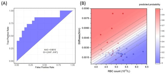 The combination of RBC count and stiffness was selected using step-wise logistic regression, as explained in the Section 2. In Figure 6A, we present the ROC curve associated with the combined marker introduced above, revealing an increased (albeit non-significantly; see Figure S3) area under the curve of 0.82 (95% CI: 0.74–1) compared to the case of stiffness alone (Table 2). A likelihood ratio test was conducted, comparing the full model with two parameters (stiffness and RBC count) against two nested models, each with a single variable. Statistical significance was observed in both instances when comparing the full model with stiffness alone (LR chi2(1) = 5.16, Prob > chi2 = 0.0232) and with RBC count alone (LR chi2(1) = 8.6, Prob > chi2 = 0.003).