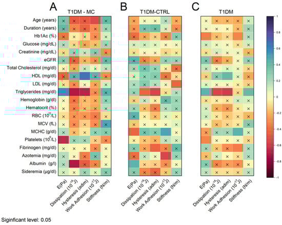 In Figure 7, we present the outcomes of a correlational analysis involving all the investigated mechanical parameters (depicted along the x-axis) and continuous demographic, clinical factors (age, disease duration), and biochemical indicators (depicted along the y-axis) for T1DM patients with microvascular complications (MCs) (A), T1DM patients without MCs (B), and for all participants in the study (C). The data are represented in terms of Spearman’s correlation coefficients. The significance of these correlations was determined through a power analysis, depending on the sample size and the strength of the correlation. Non-significant coefficient values are marked with an “x”.