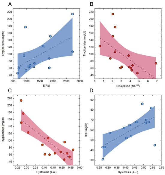 Scatter plot of selected circulating lipid markers in MC patients as a function of mechanical parameters. Triglycerides show a positive correlation with stiffness (A) and negative correlations with both dissipation (B) and hysteresis (C). HDL displays a positive correlation with hysteresis (D). The shaded areas represent the 95% confidence intervals, and the dashed lines indicate the best-fit regression lines. Data points correspond to individual MC patients.