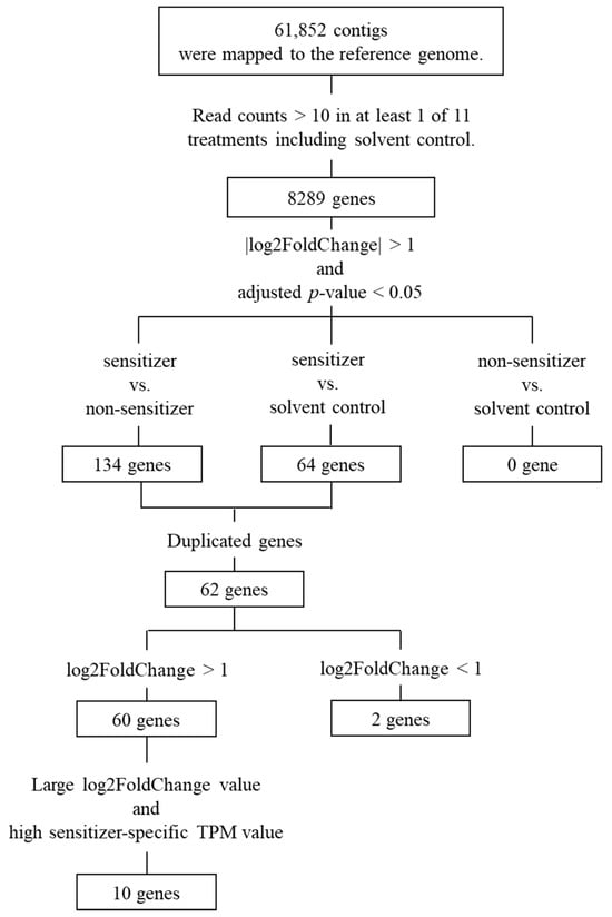 There were 62 genes out of 8289 genes whose expression levels altered only with the treatment of sensitizing chemicals under parameters |log2FoldChange| > 1 and adjusted p-value < 0.05 (Tables S1 and S2). Sixty of these genes were up-regulated, and the remaining two were down-regulated. On the other hand, no differences were observed between the non-sensitizing chemical treated group and the control group under parameters |log2FoldChange| > 1 and adjusted p-value < 0.05.