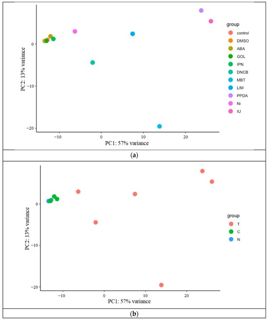 A principal component analysis was performed on these genes, and the results are shown in Figure 2a,b. Figure 2a shows that the gene expression patterns differed depending on the treated chemicals. In more detail, the groups treated with non-sensitizing chemicals and controls exhibit almost the same expression patterns (Figure 2b). In contrast, when treated with sensitizing chemicals, gene expression patterns differed depending on chemicals (Figure 2b).