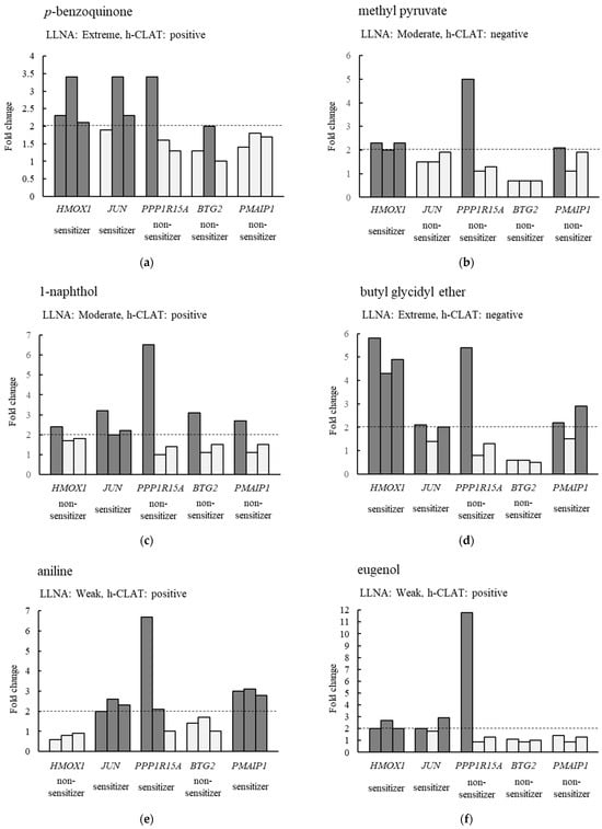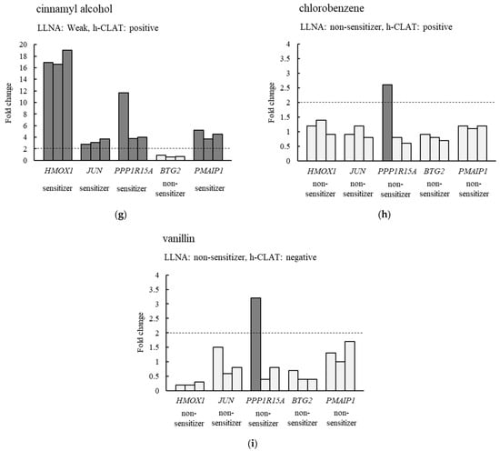 Changes in the expression levels of five candidate marker genes after chemical treatments to THP-1 cells. (a–i) The changes in the expression levels of HMOX1, JUN, PPP1R15A, BTG2, and PMAIP1 genes after treatment of THP-1 cells with p-benzoquinone, methyl pyruvate, 1-naphthol, butyl glycidyl ether, aniline, eugenol, cinnamyl alcohol, chlorobenzene, and vanillin, respectively. The results of LLNA [,] and h-CLAT [,] for each chemical are also shown. Dark gray bars indicate more than 2-fold increases in the gene expression levels compared to the control. If the expression level of the gene was increased more than 2-fold in two or more of the three trials, the chemical used in the treatment was evaluated as a sensitizer.